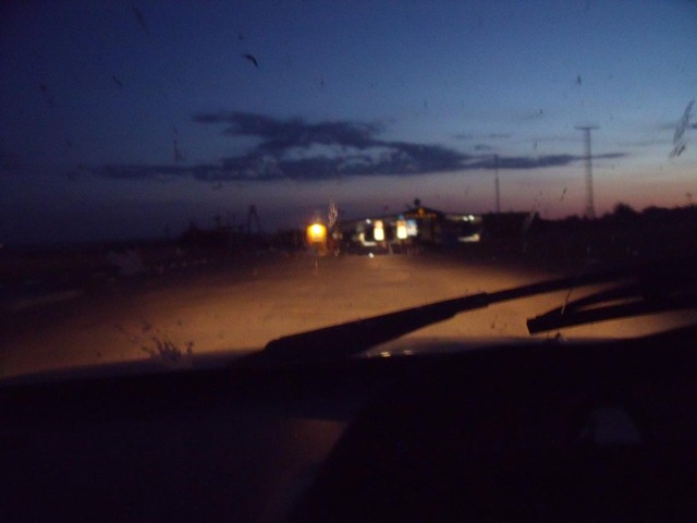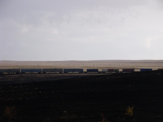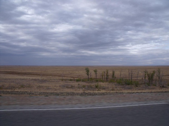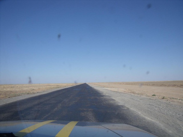 Die Marschgeschwindigkeit sank auf unter 50kmh – die Grenze würden wir wohl erst in der Nacht erreichen und dabei lief ja den Dänen das Kasachstan-Visum heute ab. So quälten wir uns durch die Landschaft – mit schlechtem Gewissen gegenüber dem Auto – nach all dem Durchhaltewillen in der Sandwüste hat es derartige Schläge nun wirklich nicht verdient. Ging aber nicht anders. Aber immerhin gab es beim Tanken nach 120 Km einen Lichtblick – der Tankwart meinte nämlich, dass uns bloss noch 20Km dieser Road of Holes bevorstünden, danach wäre es dann wieder zivilisiert – und tatsächlich. Die Durchschnittsgeschwindigkeit nahm wieder zu – die Ankunftszeit an der Grenze verschob sich wieder in Richtung Tageslicht und die Fahrt an und für sich bietet dem Schreiber keinerlei speziell berichterstattungswürdige Vorfälle mehr. Kasachische Weite halt.