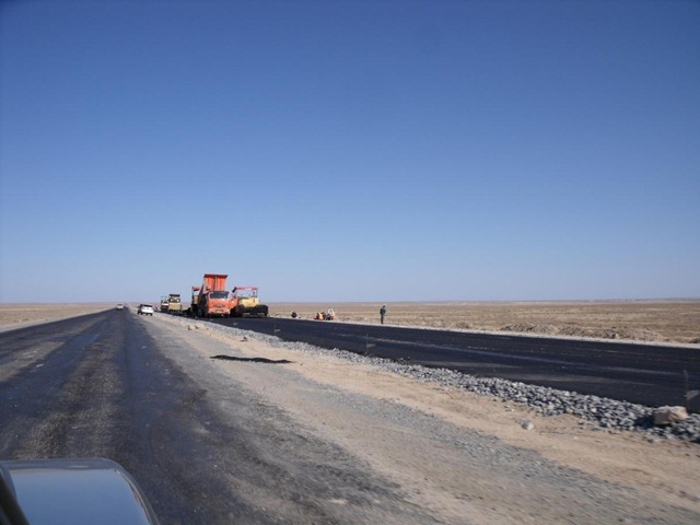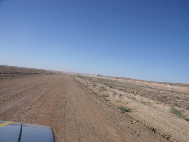 Zuerst noch ging’s recht gut voran – ca. 130 Km, dann kam die erste Baustellenumfahrung – zuerst noch gewohnt schotterig, aber bald wurde das Terrain sandiger – d.h. es gab plötzlich mehrere parallel verlaufende Pistenkanäle – durchsetzt von sandigen Mulden und üblen Schlägen – das eine ein leicht erhöhte Durch-Surf-Geschwindigkeit erfordernd – das andere materialschonend zu äusserster Langsamkeit mahnend – ein klarer, unlösbarer Interessenkonflikt. Die ersten 130Km hatten wir in gut 1.5 Stunden noch relativ locker abgespult, danach schafften wir in den nächsten 1.5 Stunden ca. 25 Km Baustellenumfahrung. So würde natürlich auch der Weg an die russische Grenze sehr lange – konkret 1000 Km = ?? Fahrstunden und anspruchsvoll werden.