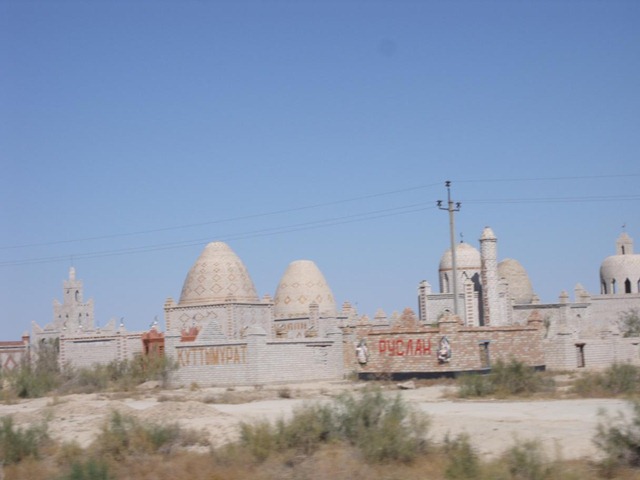 Und vorbei an malerischen Landschaften und Dörfern, wobei es sich bei diesem Bild nicht um ein Dörfchen, sondern um einen typischen Kasachischen Friedhof handelt.