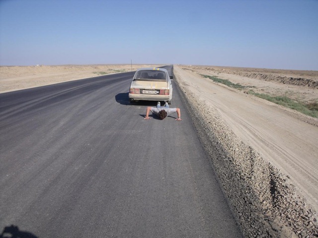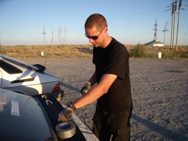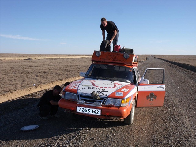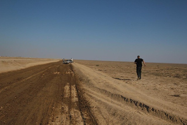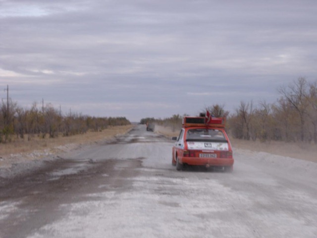 Weil wir erst um ca. 15:30 losfahren konnten, war natürlich auch die Strecke von 950 Km bis Atyrau, welche wir in zwei Tagen schaffen wollten, nicht mehr so gemütlich – auf 1.25 Tage verteilt ergeben sich doch erheblich agressivere Durchschnittsgeschwindigkeiten. Also motor on – bis zur Abzweigung, wo die rote Hauptverkehrsachse hoch nach Aktobe zieht, während die gelbe Nebenroute noch etwas weiterläuft. Bis hin zu einem Erdhaufen über die Strasse – hier in der Wildnis das eindeutige Zeichen “Strasse gesperrt”. Wobei aber trotzdem Spuren drüber führten und wir dieses Hindernis auch mit unseren tief hängenden Langschiffen schafften – also weiter – an immer tieferen Schlaglöchern vorbei – direkt auf eine Schotterpiste. Hhhmmm – die Marschgeschwindikeit sank. Und so beschlossen wir noch ca. 30 Minuten Erkundungsfahrt anzuhängen um zu schauen, ob die Strasse besser würde. Darauf reagierte unser Motor mit dem “Check Engine Lämpchen” kann alles oder nichts bedeuten – also motor on – Erkundung fortsetzen – aber es war sinnlos – die Piste wurde nicht besser und bei ca. 30Kmh Durchschnittsgeschwindigkeit war Atyrau ca. 32 Stunden Fahrzeit entfernt – etwas aggressiv für die verbleibenden 1.25 Tagen. Also kehrten wir um – was der Motor sofort mit dem erlöschen der Check Engine Leuchte quittierte. Ist wohl ein schwedisches Safety-Feature für schlechte Strassen – dachten wir – cool! Kann aber nicht sein – denn hätte der Motor gewusst was kommt, er wäre wohl mit Freuden nach Atyrau galoppiert. Und kurz darauf zog das Auto nach links – hat wohl an die Bundesratswahl gedacht oder so – war es aber nicht, sondern ein Plattfuss. Nun Räder an- und abschrauben haben wir inzwischen im Griff und das platte Rad haben wir dann traditionell rituell der Steppe geopfert und um gutes Vorwärtskommen gebeten. Hat aber nicht geklappt. 5 Km später hatte nämlich auch die Duck Fussprobleme – Plattfussprobleme! Haben wir schon erwähnt, dass sich unsere Autos schwesterlich nahestehen?