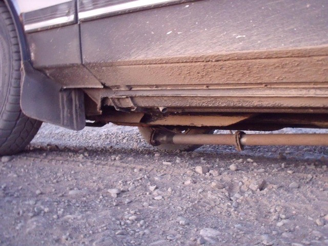 Schade nur, dass sich unsere beiden Autos inzwischen recht nahestehen und dass sie einander jeden Blödsinn nachmachen – so ermüdete dann unser Auspuff ebenfalls. Dumm nur, dass an dieser Stelle mit Draht nicht so viel auszurichten ist – der Auspuff war nämlich zuvorderst – gleich beim Auspuffkrümmer ausgeschert und hing nun wie eine nutzlose Vuvuzuela (ok – eher ein Pleonasmus) herunter. So weit so schlecht – eher unter die Kategorie Unfälle und Verbrechen fällt aber die Konstruktion dieses Auspuffs – denn der windet sich in einem Stück um die Hinterachse herum und zwar so, dass das Teil wegen des meist angerosteten Schalldämpers nicht ohne Materialschaden abmontiert werden kann. War allerdings etwas schwierig – wir erinnern uns – die richtigen Werkzeuge machen den Job! Nur hatten wir leider weder Feile noch Säge noch sonstwas geeignetes zur sittlichen Zerlegung eines Auspuffrohrs. Also musste gezwungermassen die unsittliche Methode gewählt werden – Durchschlagung des Rohrs mit einem Zimmermannhammer…