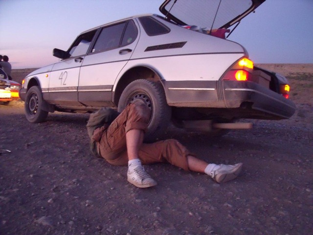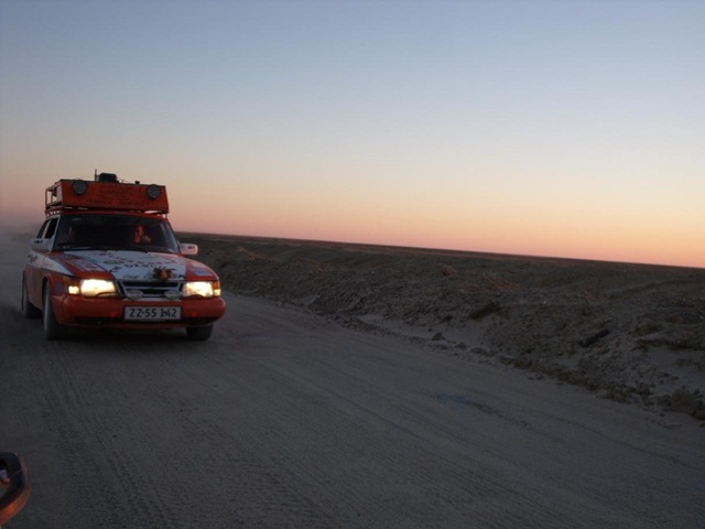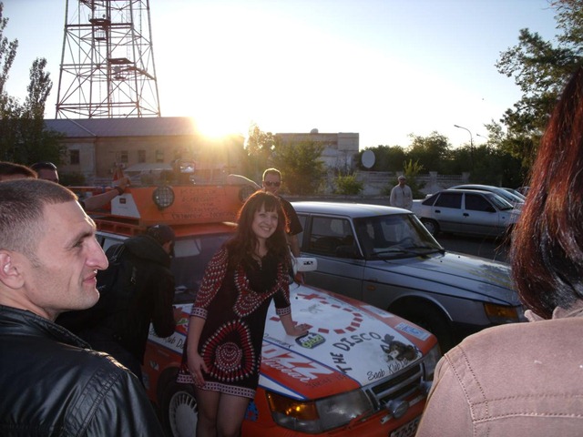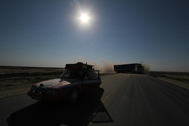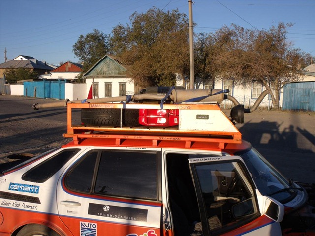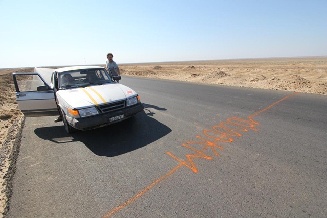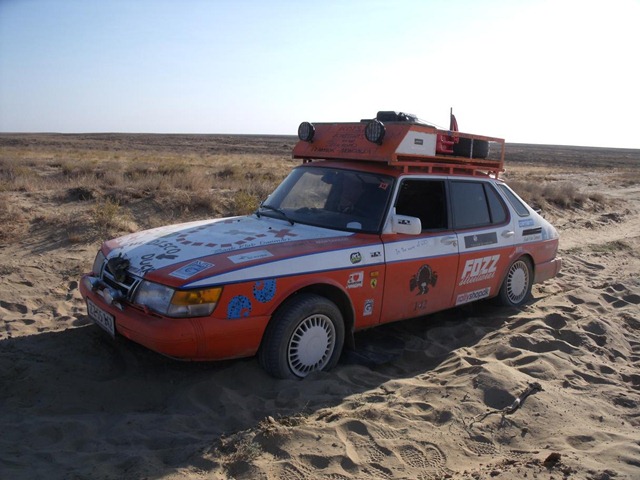 Trotz der diskutablen Betten erwachen wir gut erholt und starten bei Sonnschein die heutige Etappe – auf nach Aralsk – und zwar im neu mit Rallystreifen dekorierten Saab (hat er redlich verdient) – alles super!