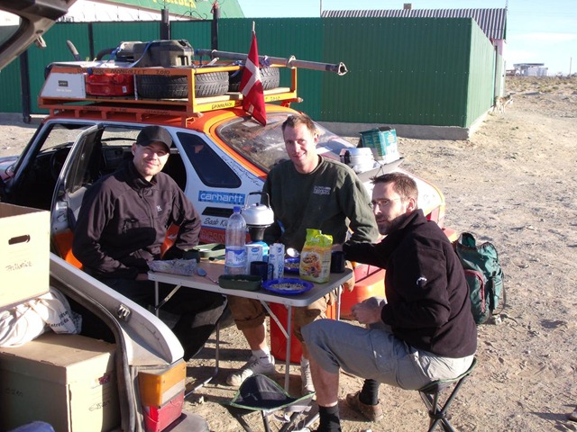 – natürlich noch geschlossen. Also haben wir die gemütliche Stimmung des Vorabends einfach weitergezogen und den Dänen auf unserem Campingtisch ein echt Schweizerisches Müslifrühstück bereitet – mit Kaffee und Kakao – herrlich!