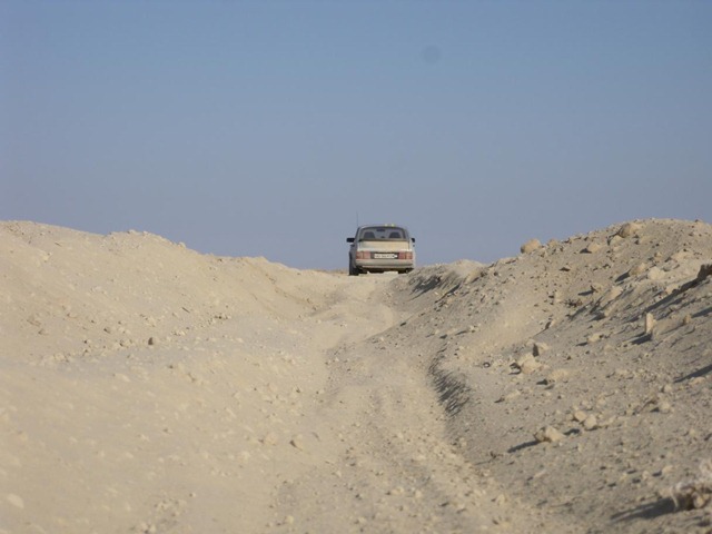 Sh…. Tja und des Abenteuers wegen waren wir ja auch noch jugendlich frohgemut ausgerüstet – hatten nicht mal eine Schaufel dabei und auch die Sandbleche waren zu Hause geblieben, da wir ja eigentlich auch keine offroad Wüstenabenteur geplant hatten. Aber erstens ist immer vor zweitens. Und so gruben wir die Duck halt von Hand aus und zogen sie letztlich dann mit der Hilfe eines entgegenkommenden Wüstenexplorers raus (natürlich war auch das Abschleppseil zu kurz, als dass wir unseren Saab in sinnvolle Position hätten bringen können). Danach ging’s weiter. Im gleichen Stil. Und nach zwei Stunden hatten wir immerhin weitere 20 Km durchkämpft – das würde hart werden – verdammt hart. Auch begannen wir zu registrieren, dass uns eigentlich keine PWs sondern nur Last- und Geländewagen entgegen kamen. Beunruhigend. Aber in der Wüste gibt es nur ein Entrinnen – hindurch. Und das taten wir – mit unserem, etwas hochbeinigeren Kamel vorwegtastend – die Duck hintendran. Wobei auch wir den Weg nicht immer optimal trafen – wie wir es durch diese Mulde mit nahezu knietiefen Fahrrillen hindurch schafften ist uns ehrlich auch fast etwas rätselhaft. Das Bild zeigt übrigens nicht die Fahrrinne – sondern bloss die eine Reifenmulde aus etwas überzeichnender Perspektive…