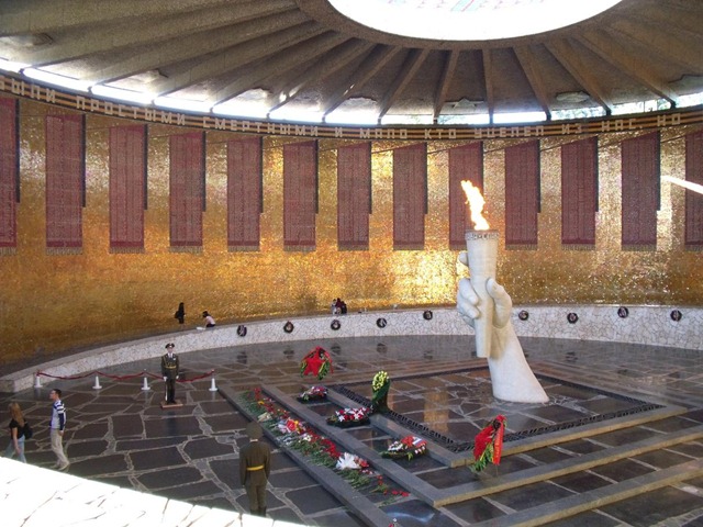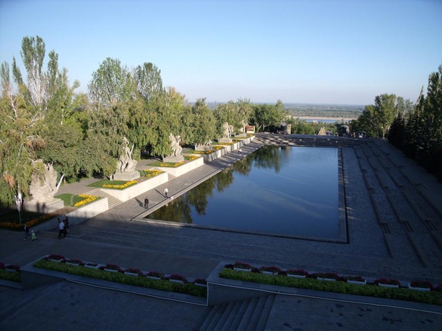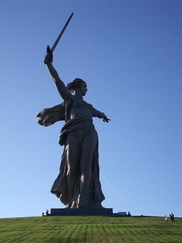 Danach GPS-getrieben ab nach Wolgograd – einmal über die Wolga und zurück und dann – weil’s auf dem Weg lag erstmal hin zum Kriegsdenkmal. Da wollen wir jetzt nicht allzuviele Worte darüber verlieren – weil die Symbolik hinter solchen Denkmälern oft etwas schwierig ist und wir nicht so genau wissen, wofür denn das Denkmal so ganz genau steht. Aber schweizerisch neutral dürfen wir festhalten, dass es ein sehr schönes und stimmiges Denkmal ist, an einem wunderschönen Platz gelegen.
