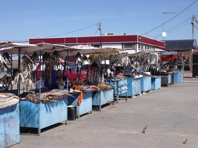 Unvermeidbar auf dieser Fahrt auch das Bestaunen der malerischen Marktstände mit regionalem Angebot – hier Trockenfisch und handgestrickte Wollsachen