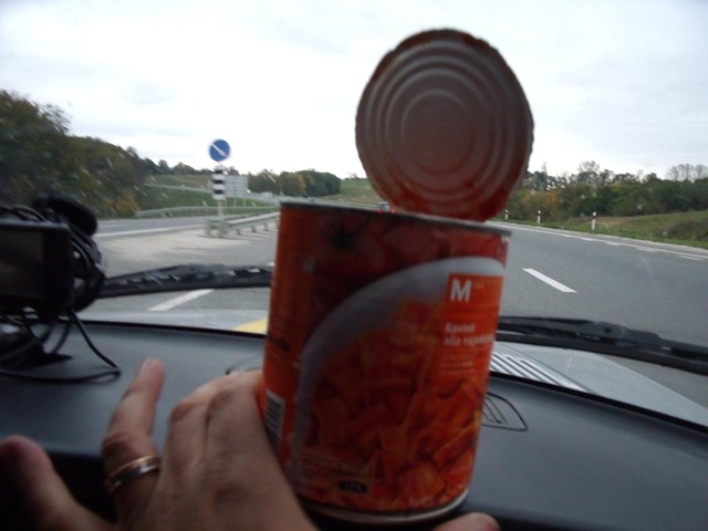 Also einmal mehr Morgen- und Mittagessen im Wagen. Zur Abwechslung mal den Dänen eine Dose kalter Ravioli schmackhaft gemacht und gegen zwei (kleinere) Dosen kalter Hackfleischfpuffer an brauner Sauce eingetauscht. Reicht für das Grundbedürfnis Essen.