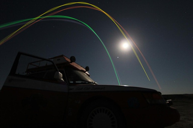 an welchem wir diesen etwas schwierigen Tag – d.h. ein Auspuff repariert und dafür zwei Platten eingefahren – trotzdem noch mit guter Moral beenden konnten. In der flachen Kasachenlandschaft liess sich auch herrlich verfolgen, wie der Mond und die Sonne – einer Kinderschaukel gleichend auf einer geraden runtersanken resp. aufstiegen. Auch das Fondue hat trotz verstimmter Mägen geschmeckt und mit Knacklichtern aus dänischen Armeebeständen haben wir Feuerwerk gespielt