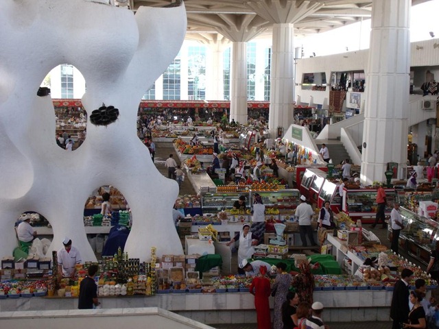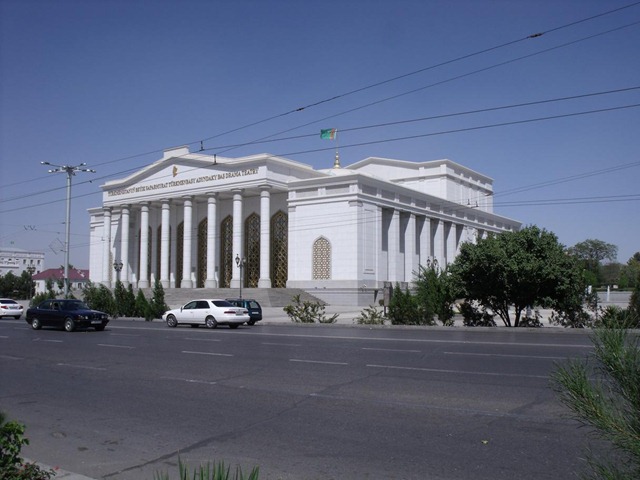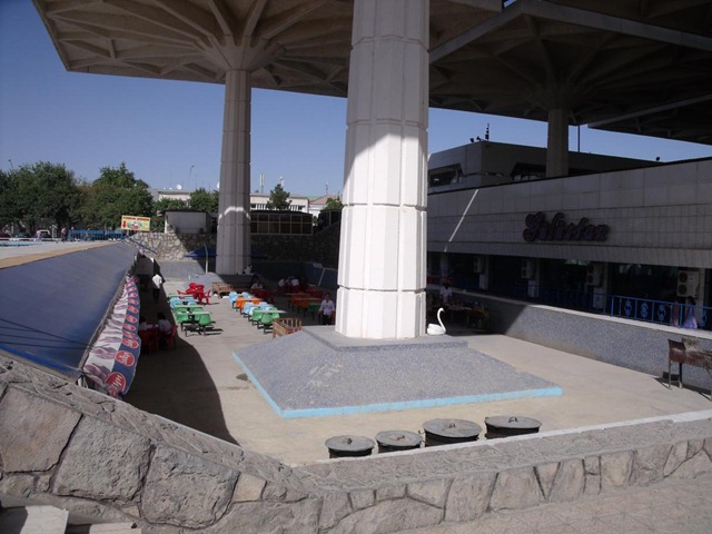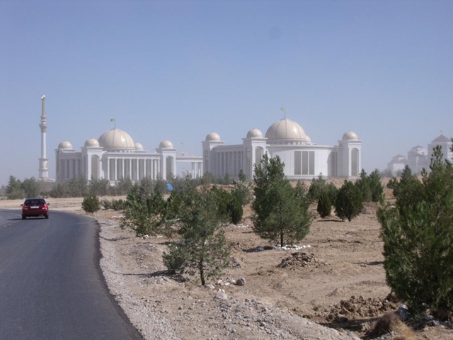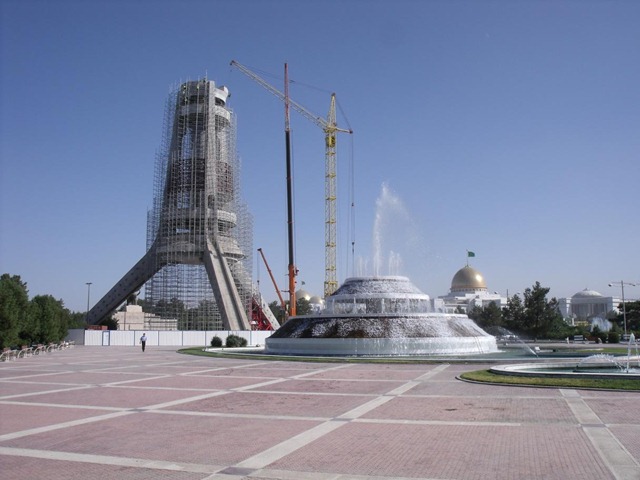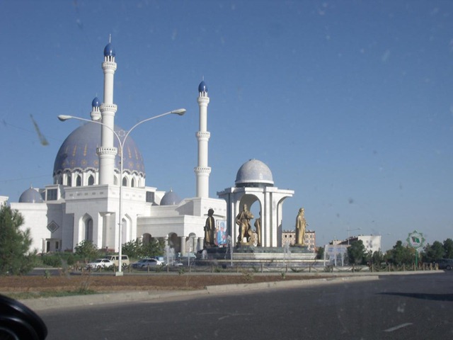 und frisch gestärkt weiter zu seriösem Sightseeing nach Downtown- wo vor allem eine Lücke auffällt – richtig – Turkmenbashi gibt es nicht mehr! Also nicht nur ist dieser Vater der Turkmenen vor ca. vier Jahren gestorben – nein sein Nachfolger – ebenfalls glaubs in einer relativen monomanen Staatsform verhaftet – wollte dem Volk nicht mehr länger zumuten, den vor ihm herrschenden Diktator anzuschauen – also wird nun dessen Denkmal demontiert – vorher stand nämlich zuoberst auf dieser Plattform der Turkmenbashi – motorgetrieben und blickte so stets der Sonne entgegen! Unglaublich. Allerdings von politischen Diskussionen wird strikte abgeraten und es wäre – nach Iran – auch gefühlsmässig eine zerrissene Ausgangslage – denn zumindest vom äusseren Schein machte weder das Land noch seine Leute einen unglücklichen Eindruck – und dies obwohl das Land im Internet in der Diktaturskala in etwa auf die Stufe von Nordkorea eingeslottet wird. Für uns spürbar war nur, dass es wirklich an jeder Ecke einen Polizisten hatte und dass man vor dem Präsidentenpalast das Trottoir räumen und auf die andere Seite wechseln musste.