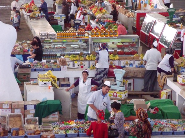 Nachdem wir also die Dänen wiedergefunden hatten, ging’s per Taxi auf zum Stadtsightseeing – zuerst zum Basar – immer wieder ein Spektakel und dann zu Fuss in Richtung Moschee, die wir aber nicht erreichten, weil die offenbar in der Dämmerung die richtungsweisenden Minarette einfach im Boden versenken – dumm gelaufen. Wobei gar nicht so sehr, denn auf dem Weg dahin wurden wir gleich an zwei Hochzeiten eingeladen – schöne Ballsäle – festlich gekleidete Gäste und dann wollten uns diese Menschen wirklich – ehrlich gemeint zu diesem Fest einladen! Nun da waren wir dann zu sehr konservative Schweizer, als dass wir der Festgemeinde unsere schon viel durchlebten Kleider zumuten wollten – ganz abgesehen davon, dass auch die Verständigung auf eher tiefen Baudraten funktionierte – weil die Handshakes halt oft wiederholt werden mussten. Aber immerhin – diese “Gespräche” und Einladungen haben natürlich ein ganz anderes Licht auf Uzbekistan geworfen als bisher.