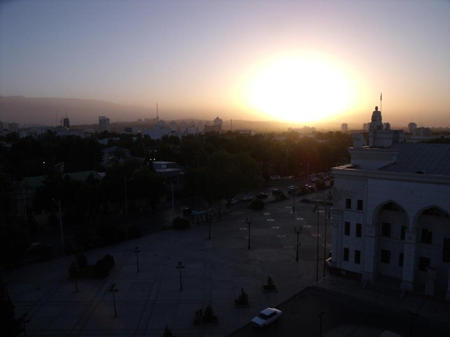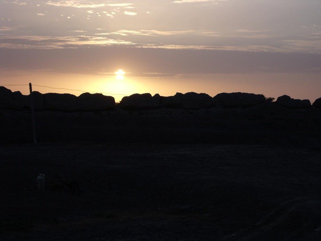 Dies ist eine der legendärsten Seidenstrassenstation – zusammen mit Buchara wohl eben einer der wichtigsten Knotenpunkte in Zentralasien. Bedeutet aber nicht, dass dies heute auch noch so wäre, resp. dass die Strasse dazwischen angemessen gepflegt würde. Zuerst zwar noch auf europäischem Niveau mussten die letzten 150 Km auf rumpelnder schlaglochübersäter Betonpiste erduldet werden. Machte v.a. das Essen – Brot mit Corned Beef – irgendwie müssen wir ja unsere Vorräte etwas dezimieren – etwas schwierig. Immerhin aber gab’s einen sehenswerten Sonnenuntergang – eigentlich war alles gut.