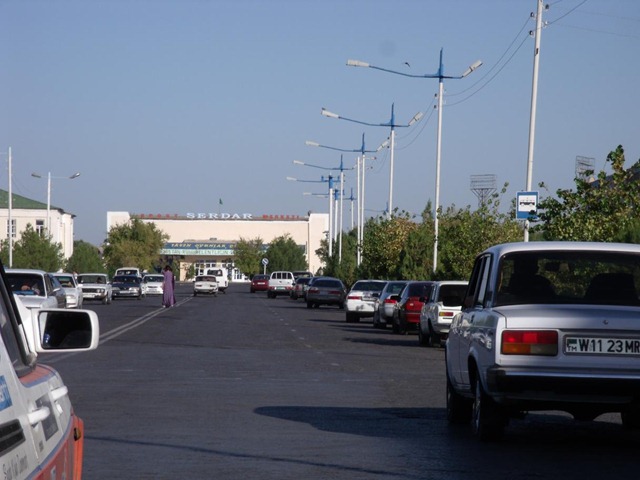 Und natürlich kann man bei einer solchen Rumpelpiste halt einfach nicht zufahren und so zogen sich die ca. 350Km endlos dahin – die Landschaft half einem auch nicht wirklich, die Fahrt als kurzweilig zu empfinden – haben wir schon erwähnt, dass Turkmenistan eigentlich nur aus Wüste und Baumwollplantagen besteht? Und so liefen wir erst gegen 18:00 endlich in Mary ein. Und ja Proud Mary kept us turnin – denn bei derart breiten Prachtstrassen sind halt leider die Strassenschilder – falls überhaupt kaum zu lesen und so mussten wir einige Suchkreise drehen, bis wir endlich unser Hotel gefunden hatten.