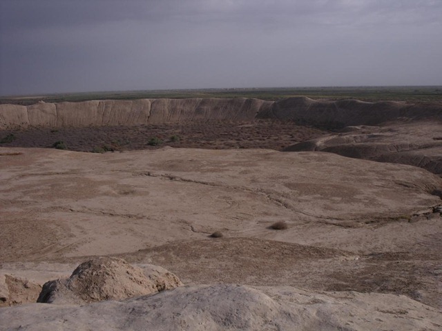 Und hier sieht man nicht etwa ein Stück Mond, das auf die Erde gekracht ist, sondern den Trichter der allerersten Siedlung – wie schon erwähnt – hat es in Turkmenistan ausser Baumwollplantagen halt oft auch Wüste…