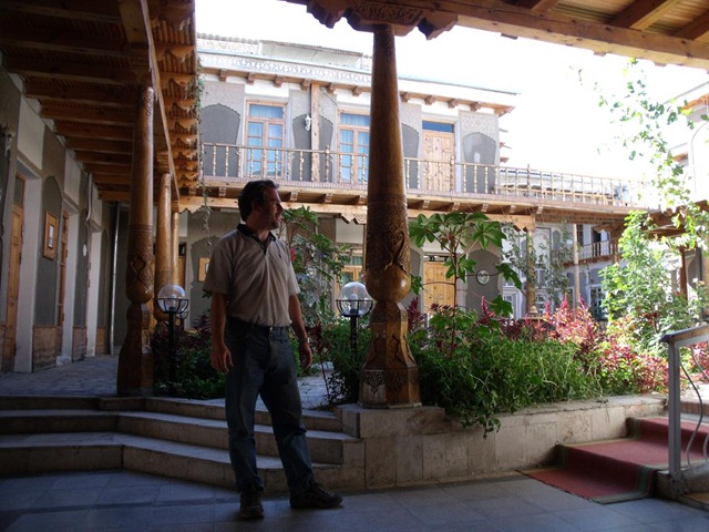 Und wenn uns Mary turning gekeept hat, dann hat uns Buchara so richtig durchgerollt – nahezu in den Wahnsinn getrieben, denn die Agentur hatte den Dänen doch tatsächlich ein Hotel in der Innenstadt gebucht und die ist in Buchara noch in mittelalterlichem Zustand – da fährt keiner freiwillig rein. Als wir dann zum dritten Mal denselben Polizisten umkurvt hatten, waren dessen Nerven (oder Gehör wegen unseres röhrenden Auspuffs) am Ende und er befahl uns auf die Seite. Danach winkte er den nächsten Taxi ran und befahl ihm, uns zum Hotel zu führen. Klappte nicht schlecht – nur dass sich auch dieser Taxi aus der Innenstadt raushielt und uns einfach an die Stelle führte, von wo aus man nur noch 100m laufen musste. Danach wollte er dann auch noch USD 20 für seine von uns nie bestellten Dienste und stiess unflätige Wörter aus, als wir ihn auslachten und ihm übliche USD 2 offerierten – haben wir schon erwähnt, dass uns diese ersten Usbeken eher frech reinkamen? Egal – im Hotel waren sie supernett, orderten sofort ein Detachement Späher ab und führten uns zum Hotel – zum Glück haben wir bei Nacht nicht gesehen, durch welch enge Gassen, Schlaglöcher etc. wir durchfahren mussten – ich weiss nicht ob wir wirklich hingefahren wären.