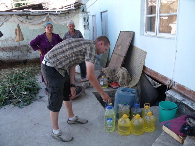 Und eine Stadtbäuerin mit Goldzähnen (ist wohl Statussymbol oder Konfirmationsgeschenk hier – haben alle) beäugte und belächelte uns neugierig – ah Turisti! Aus dem Keller wurde dann der kostbare Saft gehoben – in alten 5 Liter Pet-Limonadekübeln. Und in einem dubiosen 30 Liter Eimer aus einer Chemikalienfabrik. Und weil dann noch 30 Liter fehlten, wurde eine Autowerkstatt angelaufen. Auto über Grube gefahren –und in einen leeren Kanister und in zwei leere Motorölbehälter umgefüllt.