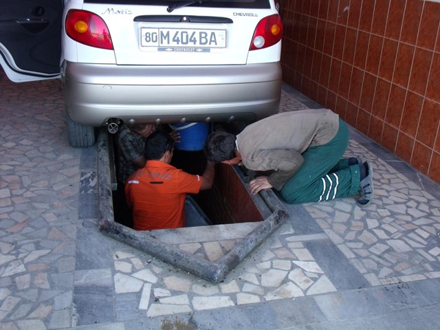 Nur ganz so entspannt war’s halt nicht – allzuviele korrosive Elemente wollten wir schon nicht zulassen und nach ca. 8000 Km Hinweg müssen wir schauen, dass uns unser Auto auch die mindestens 8000Km wieder zurück fährt. Also war erste Priorität die Mechanikersuche. Hierbei wurden wir vom Nachtportier des Hotels, einem Ökonomiestudenten hervorragend unterstützt – er überstimmte sogar den Hotelmanager und befahl: Wenn man einen guten Mechaniker braucht – geht man nicht zum Usbeken sondern zu einem Russen. Gesagt getan – hingerollt. Doch war es gar nicht so einfach – zwar stürmten sofort drei Russen aus deren Pausen-/Wohnraum hinter der Garage in die Werkstatt – als sie aber den Wagen sahen, wollten sie erst abwinken – vertrauenserweckend, wenn der Mechaniker weiss was er kann. Mit etwas Überredung gelang es aber, ihnen zu erklären, dass die Reparatur nicht markentypisch und relative einfach war – sahen sie auch so – also wurde Michael mit einem Russen in den Tuningshop nebenan gesandt, eine passende Bride zu kaufen. Dabei wurde ihm auch klar gemacht, dass er nur bezahlen, nicht aber den Mund aufmachen solle, sonst würde die Bride das doppelt kosten!
