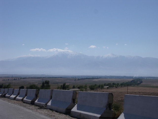 Also weiter – an unzähligen schiesswütigen Ordnungshütern vorbei – schön korrekt – und immer überholen uns rasend schnelle Usbeken – wobei ich dann auch sehe – wie die bei Polizeikontrollen verfahren – motor on – ab durch die Mitte. Und tatsächlich – es funktioniert – als ich mit strikt 60Kmh im 60er durchcruise springt doch tatsächlich so ein grüner Guerilla im letzten Moment auf die Fahrbahn und gestikuliert mit der Laserpistole – aber da war bremsen eh nicht mehr möglich – also entschuldigend mit den Achseln gezuckt und weiter – schliesslich wollen wir ja noch bis Tashkent und können nicht überall Schwätzchen halten. Die Fahrt schön – vorbei an den schneebedeckten Gipfeln des Pamir Gebirge – welches ja mal ein Zwischenziel war – nun vielleicht ist es gar nicht so schlecht, unseren treuen Saab nicht auch noch da hochjagen zu müssen.