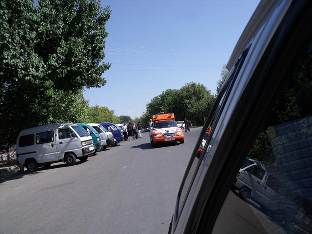 An der Grenze folgte dann der bestens bekannte Postenlauf – mal wieder disziplinengetrennt, d.h. Passagiere und Fahrer werden getrennt abserviert. Austritt aus Usbekistan war eigentlich ganz ok – jedenfalls als wir die Hemmungen ablegten und uns beim Schlangestehen an die Lokalmentalität anpassten. Das geht nämlich so: Da steht einer bei einem Schalter und man läuft westeuropäisch korrekt, auf hinreichenden Diskretionsabstand bedacht hinzu und stellt sich hintenan. Typischerweise kommen dann ca. 5-10 Zentralasiaten und quetschen sich in jede erdenkbare Lücke, welche zwischen dem höflich wartenden Westeuropäer und dem mutmasslichen Ziel der Warterei existiert. Und so eingekeilt kann man dann so lange warten, bis der allerletzte Ureinwohner des Bezirks abgefertigt ist. Geht aber auch anders: Fisherman hatte sich nämlich mit Ellbogen- und Körpereinsatz seinen Platz in der Warteschlange bewahrt und war bis an den Passschalter vorgestossen, als wir Fahrer ca. 10 Nasen hintendran ebenfalls aufliefen – also kurz unsere Pässe nach vorne durchgereicht – schliesslich sind wir ja eine Gruppe – und für einmal keine Freunde gefunden – muss auch nicht immer sein…