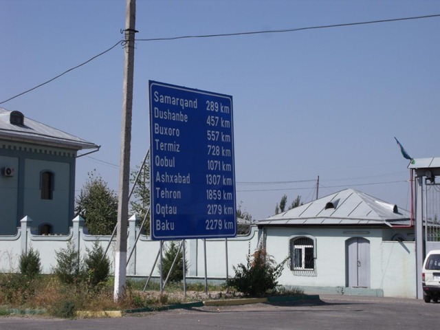 Wie z.B. hier, wo ein pensionierter Local, spontan zu uns ins Auto sass und den uns Weg zu einem auch für Fahrzeuge geöffneten Grenzübergang weisen wollte – und zwar gratis und franko (bezahlte hilfe gibt’s natürlich überall massenweise – wobei dies meist weniger mit Hilfe als mit modernem Raubrittertum zu tun hat). Allerdings konnte uns auch dieser Ortskundige nur teilweise helfen, weil auch der von ihm anvisierte Grenzübergang für Fahrzeuge geschlossen war. Aber er half immerhin, zu erfragen, wo wir denn nun eine Grenzüberfahrung vornehmen könnten – tja – 100 Km zurück Richtung Samarkand sollte es klappen – also los. Und tatsächlich – dieses Strassenschild bewies uns deutlich, dass hier Fernfahrer erwartet werden.