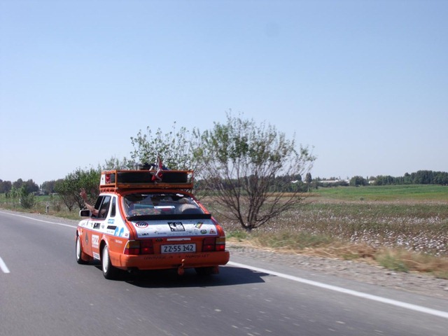 Einreise dann nach Uzbekistan – deutlich unstrukturierter. Highlight war die erste Station: Grenzarzt – dh. Befragung, ob man sich wohl fühle und anschliessend staatlich verordnete und durchgeführte Temperaturmessung – sehr strange! Danach dann Formulare im Doppel ausfüllen etc. und ab ging’s ein Haus weiter, mit Wagen – allerdings erst, nachdem unsere treuen Saabs ein Desinfektionsbad über sich ergehen lassen mussten (dem Nachbar scheint man vermutlich alles zuzutrauen). Also im nächsten Haus dort ging’s dann aber erst richtig ab – denn nun musste jeder sein Gepäck durch die Durchleuchtungsmaschine lassen. Haben wir dann so verstanden wie beim Fliegen – dort wird ja auch immer nur das Handgepäck durchleuchtet – der Rest blieb im Wagen – hat die lokale Stationsvorsteherin aber nicht gestört. Extrem versessen aber war sie auf Medizin – ob wir Pillen dabei hätten – nein sicher nicht, wir haben ja vom Turkmenbashi gelernt, dass Turkmenen nie krank sind weil sie keine Spitäler haben (oder war’s umgekehrt?). Egal – dann abschliessende Fahrzeugbesichtigung – wo natürlich das restliche Gepäck gefliessentlich übersehen wurde. Nicht übersehen wurden aber unsere Zigarrenkisten, wobei man deren Inhalt aber direkt annektierend als Gastgeschenk erkannte – die Dame liess es sich tatsächlich nicht nehmen, auch Grenzer, welche sich noch nicht selbst bedient hatten, zuzulangen und zündete den einen, der sich als Nichtraucher outete sogar noch an – unglaublich frech – aber was soll’s wir waren durch und rollten Buchara entgegen. Natürlich im den Strassen angemessenen Marschtempo, so dass wir erst kurz vor Dämmerung ankamen – ok.