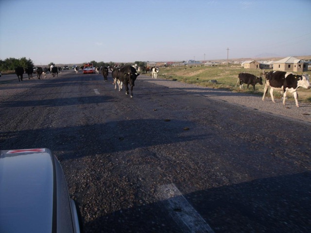 Die Kuh in Kasachstan – irgendwo in den weiten Steppen dieses Landes herumzottelnd – dann und wann auch auf der Strasse unterwegs – Freiheit pur!